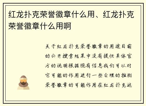 如何注册红龙扑克账号 注册红龙扑克账号主要包括访问官网、填写信息、邮箱验证几个环节,具体流程你可以参考下表: | 步骤 | 操作说明 | 备注与注意事项 | | :-- | :-- | : | | ① 访问与下载 | 在浏览器中输入官方网址或在应用内搜索官方应用。 | • 官网地址:建议访问 ` 。• 苹果用户:由于应用未在国内App Store上架,你需要使用海外Apple ID(如美区或港区...